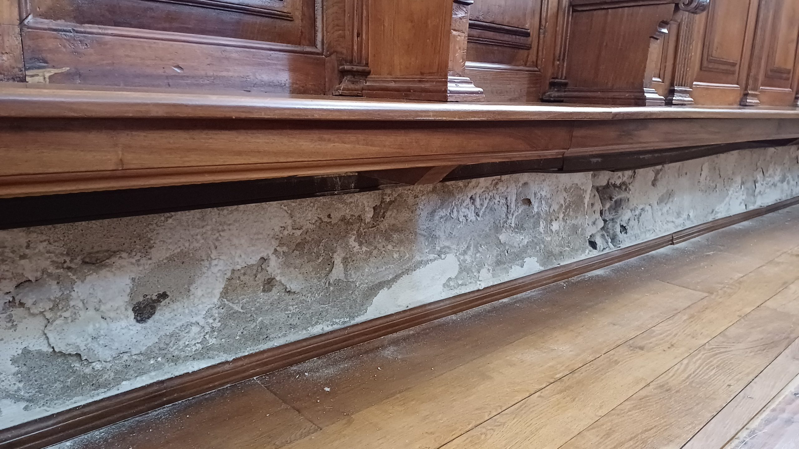 Nella zona absidale della muratura perimetrale est è stato rilevato un problema di umidità di risalita capillare, che ha danneggiato sia la muratura sia gli stalli lignei del coro e la predella sottostante.
