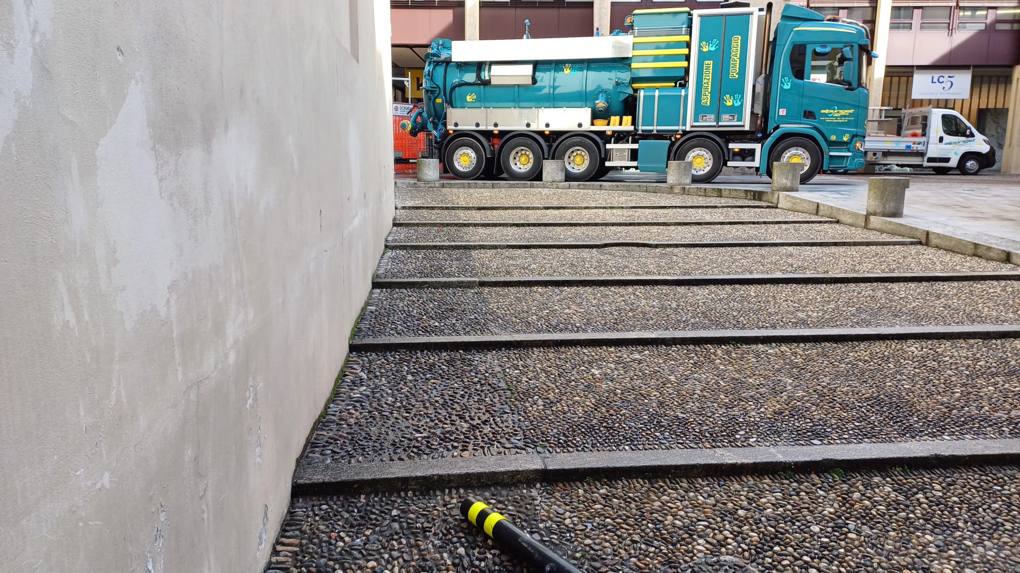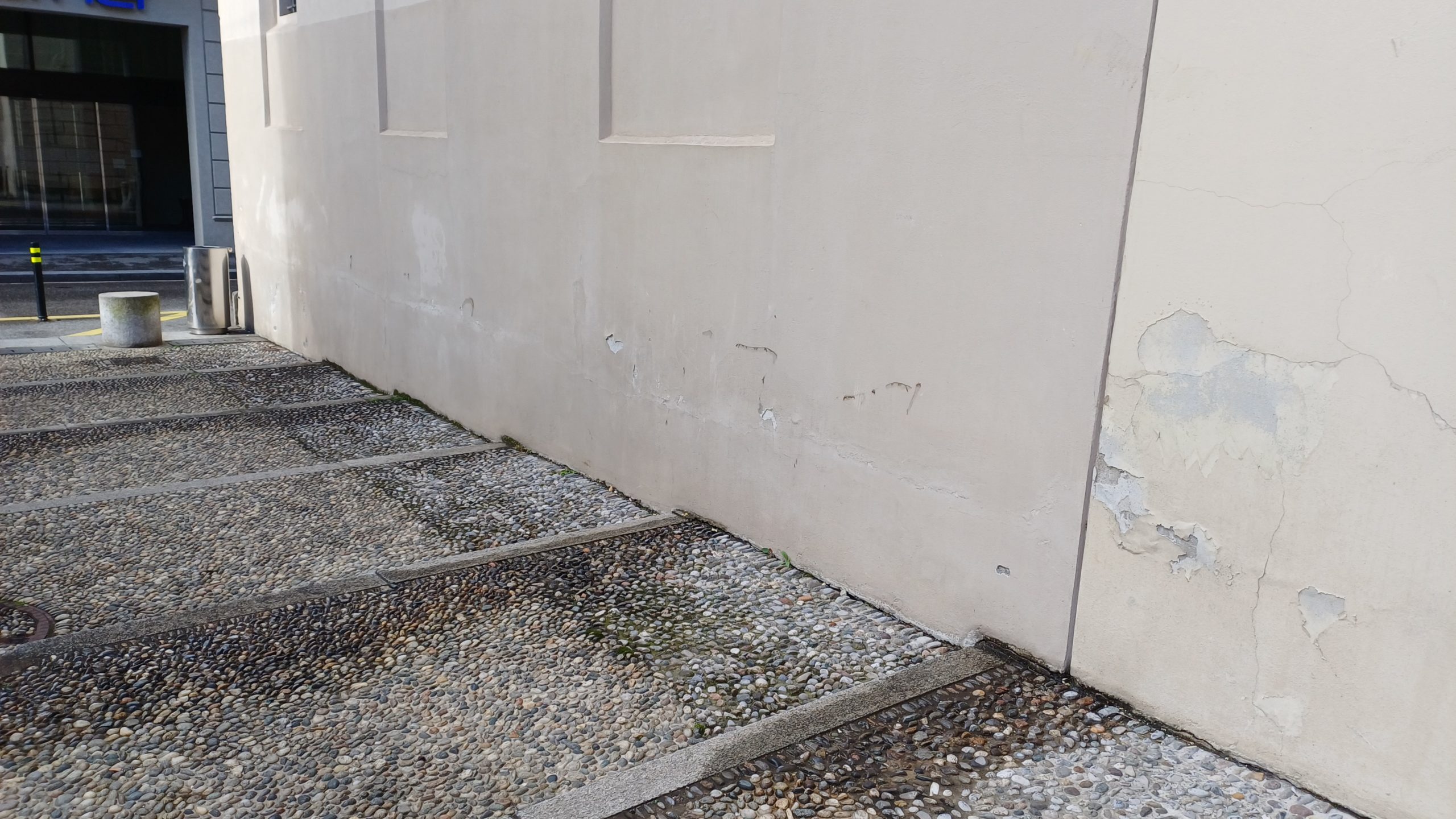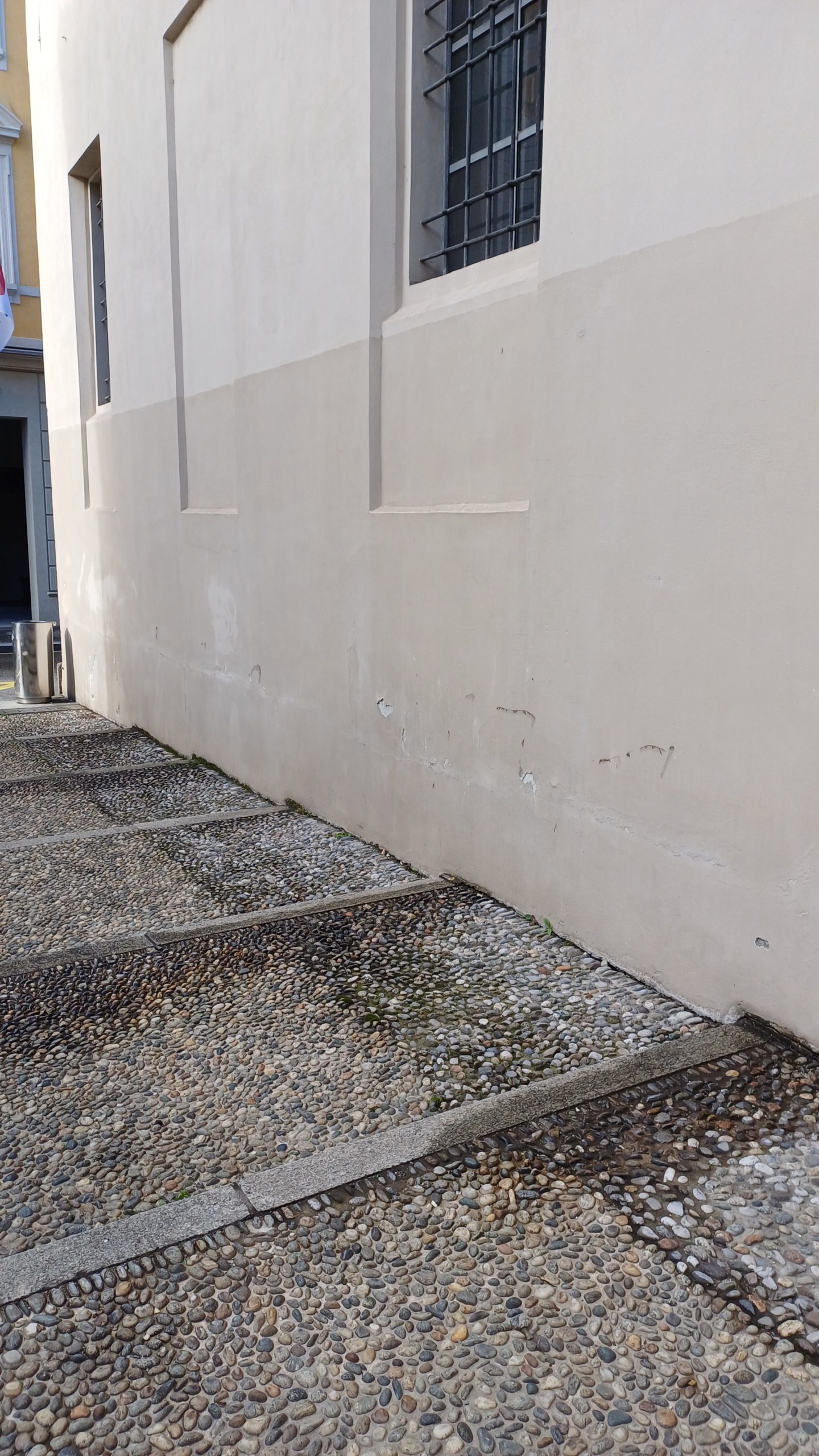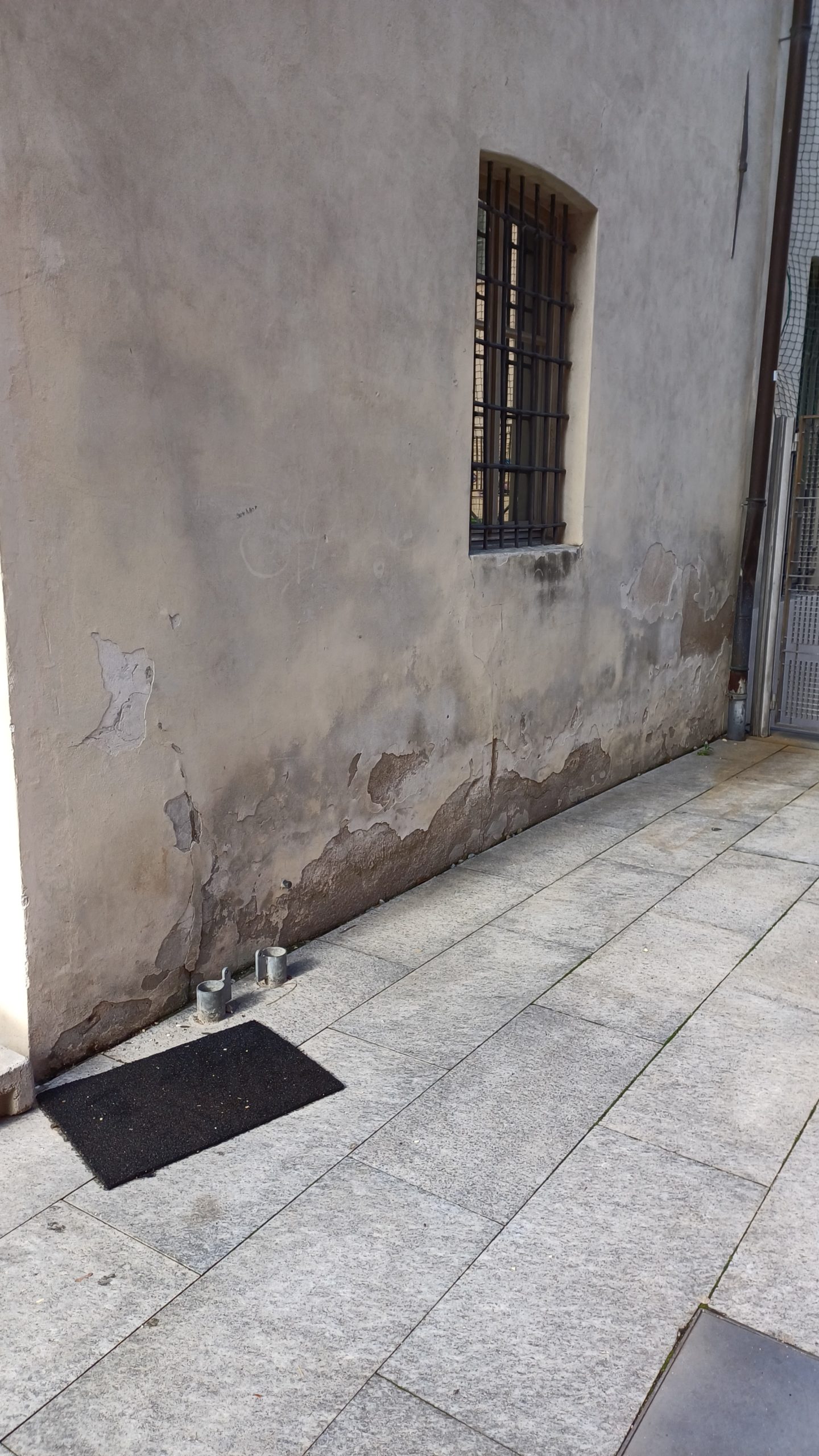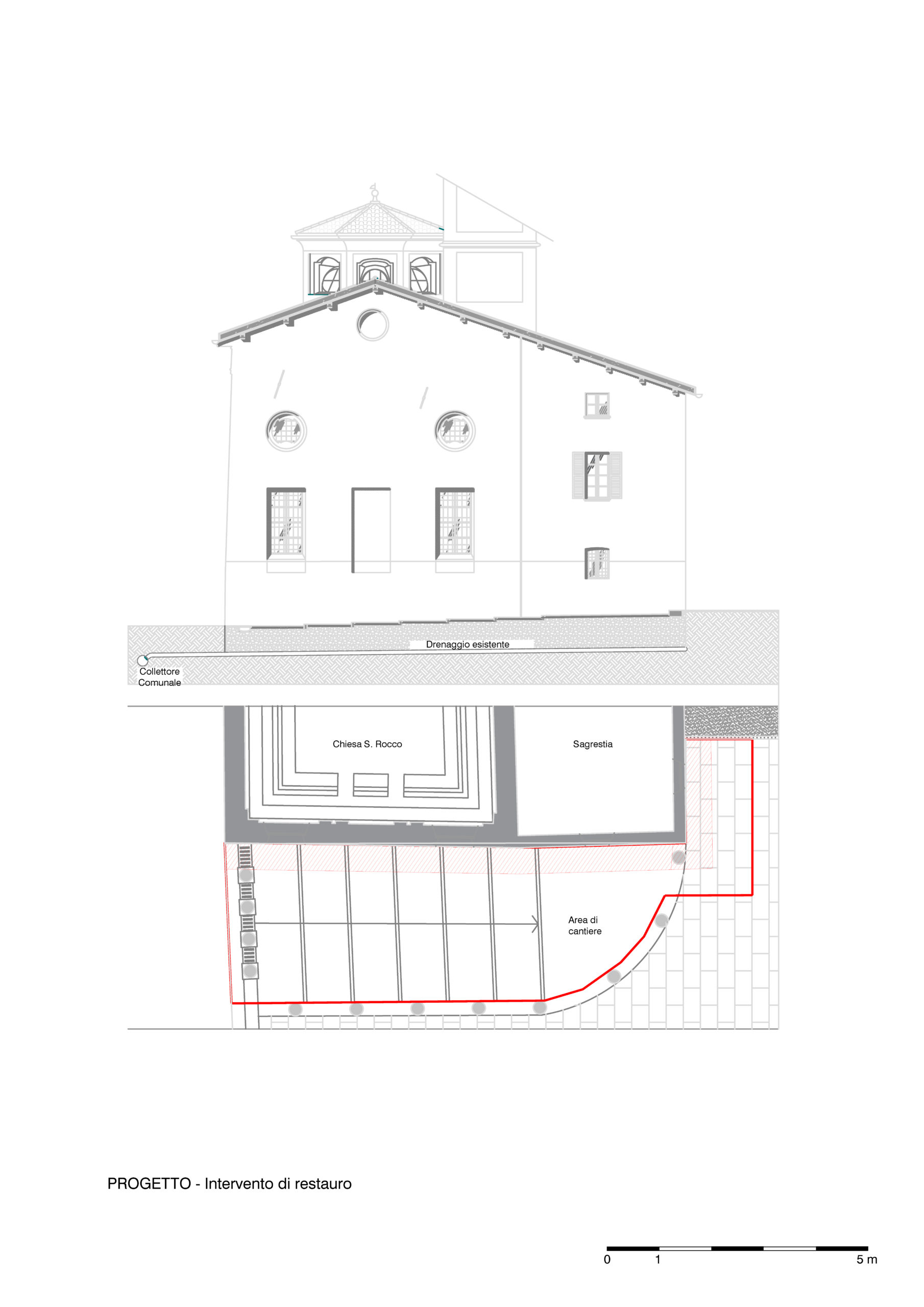 L’intervento consiste in uno scavo lungo la parete est fino alla quota del sistema di drenaggio esistente, così da verificare la presenza di malte non idonee. Successivamente verrà posato un nuovo sistema di drenaggio con un bauletto di materiale traspirante (ghiaia lavata). Sopra di esso sarà ripristinata la pavimentazione, lasciando una piccola fascia lungo le pareti perimetrali per favorire la circolazione dell’aria.