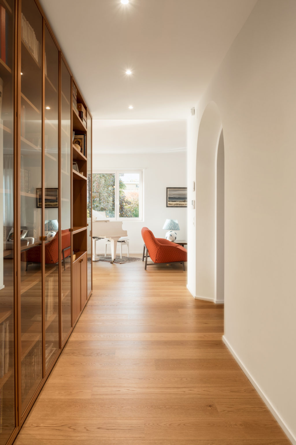Con l’intervento si è realizzata l’intenzione della committenza di unificare la zona giorno in un unico ambiente. I tavolati che dividevano le varie zone sono stati demoliti e i pavimenti del piano smantellati per permettere di realizzare un nuovo riscaldamento a serpentine, già presente al piano seminterrato.